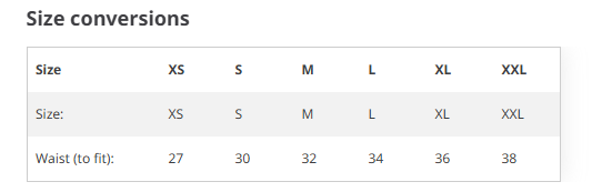 S 30" M 32" L 34" XL 36" 2XL 38"